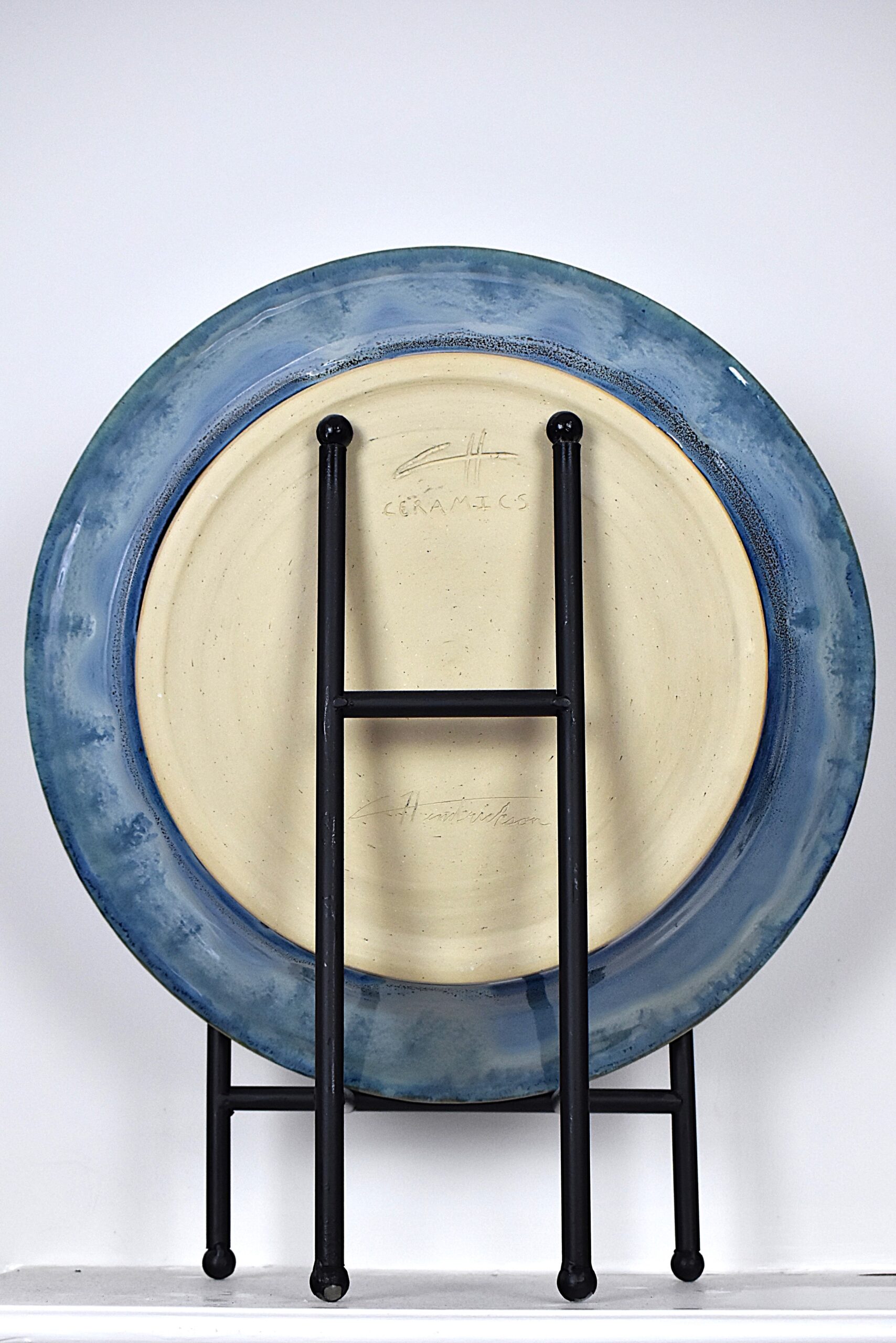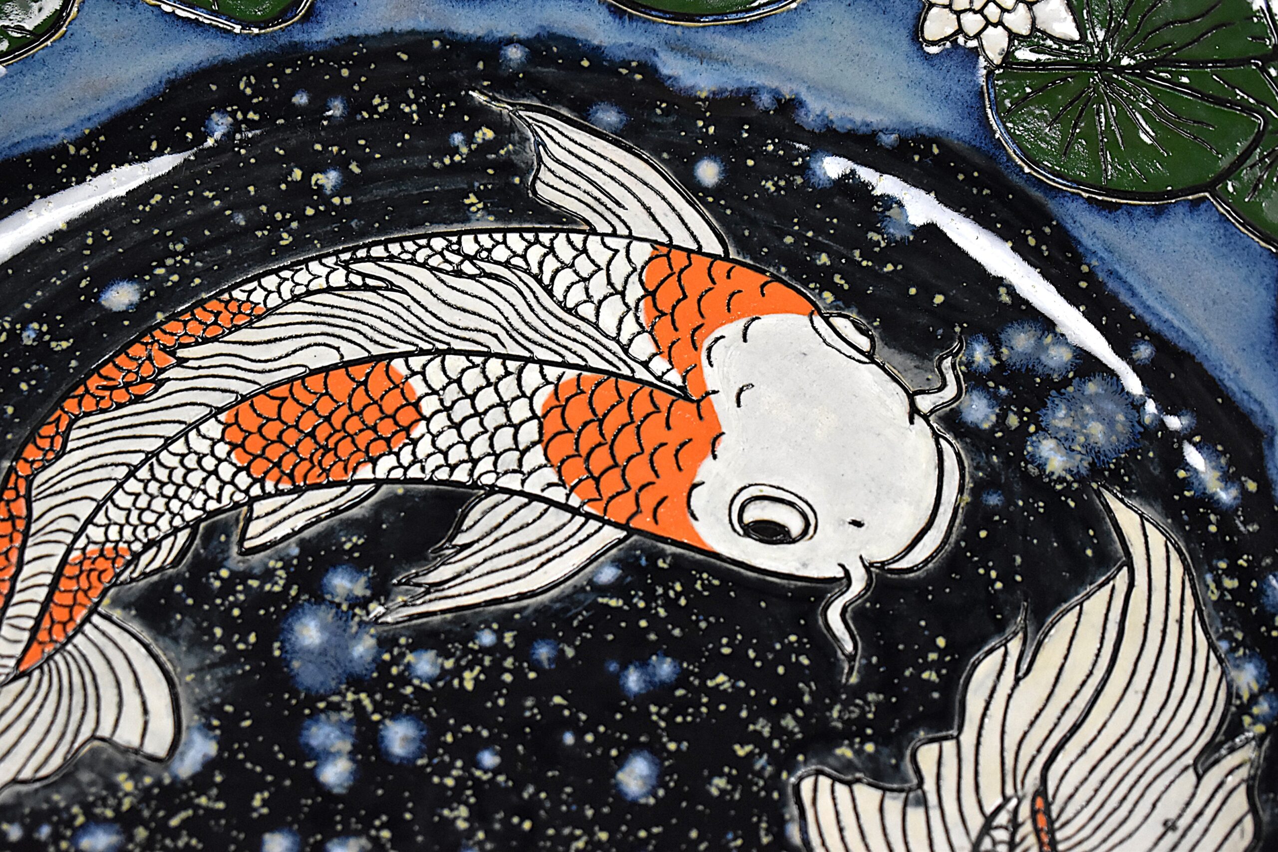 Hand-thrown plate with inlayed linework of koi fish and water lilies. The plate is slightly dipped in the middle creating an illusion of the fish swimming in a bowl. This unique plate will surely be a statement piece in any room.